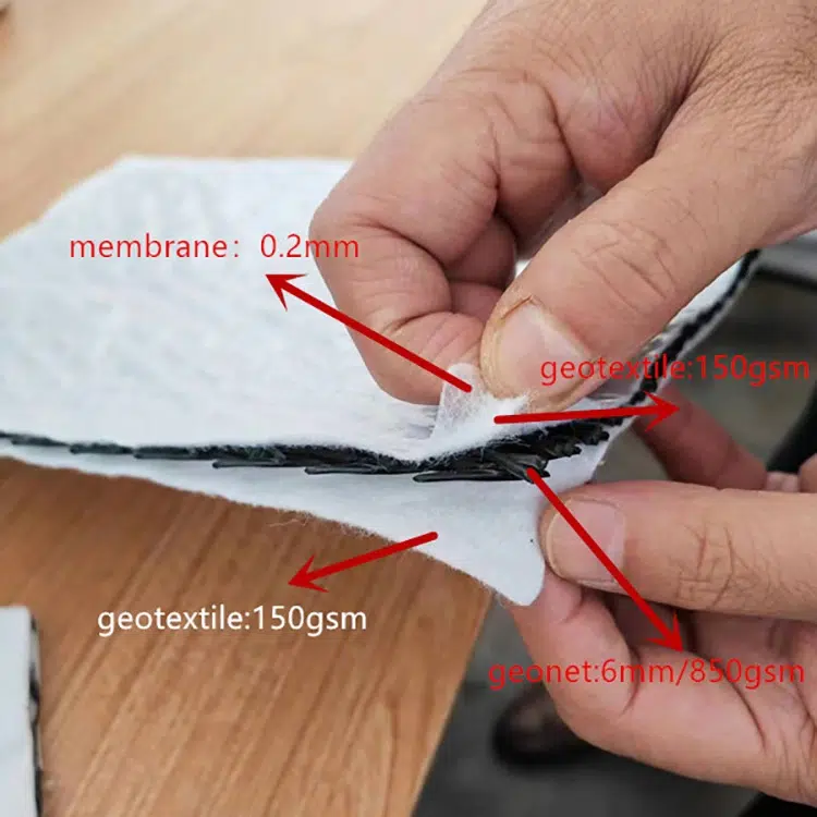 - Geonet–geotextile composites (geonet geotextile) Most projects specify a geonet geotextile laminate (aka drainage composite): nonwoven geotextiles are bonded to one or both sides of the geonet core to act as filters and separators. The geotextiles keep fines out of the core; the core provides high flow capacity.